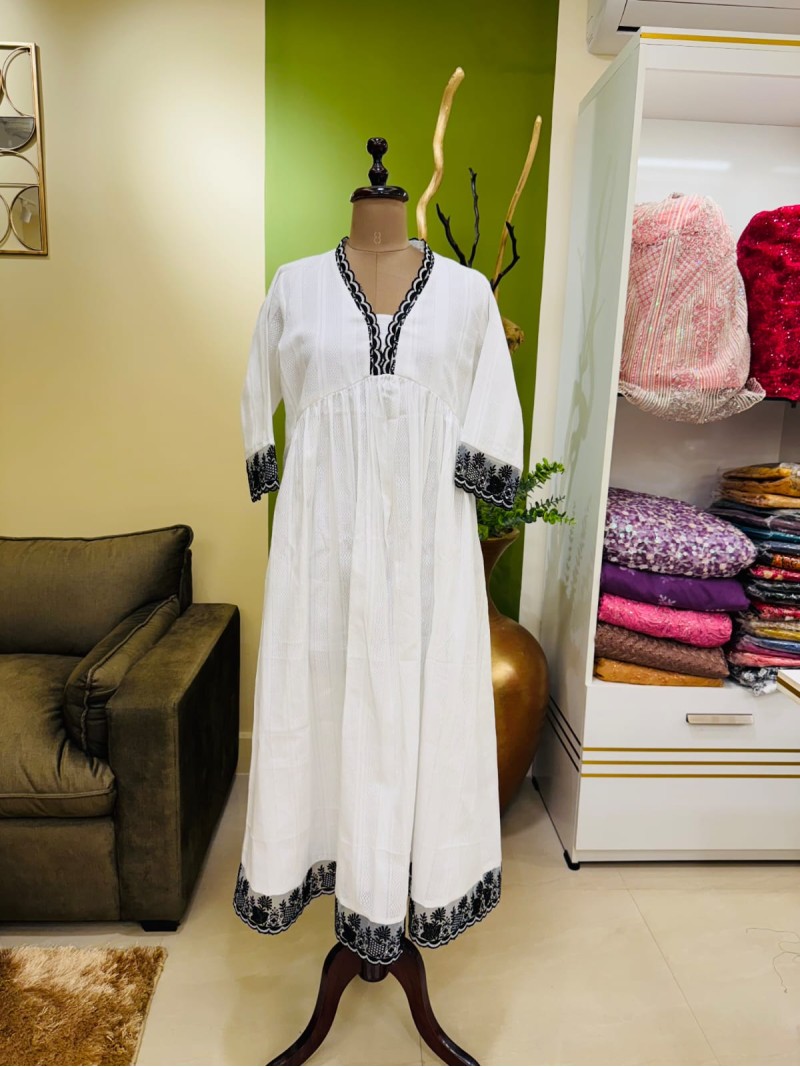 This elegant Aliya cut top is crafted from soft cotton, offering a flowy silhouette for all-day comfort. The delicate lace detailing on the sleeves and neckline adds a touch of sophistication, making it perfect for both casual and semi-formal wear.